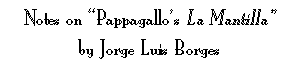In "Pappagallo's La Mantilla", Borges, with characteristic slyness, creates another, and hypothetical Borges, who wrings from the author's prose the premise from which the entire work proceeds (with the depth and sonorousness of a recitation of names of the dead): the book is simply a description of the unravelling, stitch by stitch, of the black mantilla belonging to the author's aunt!